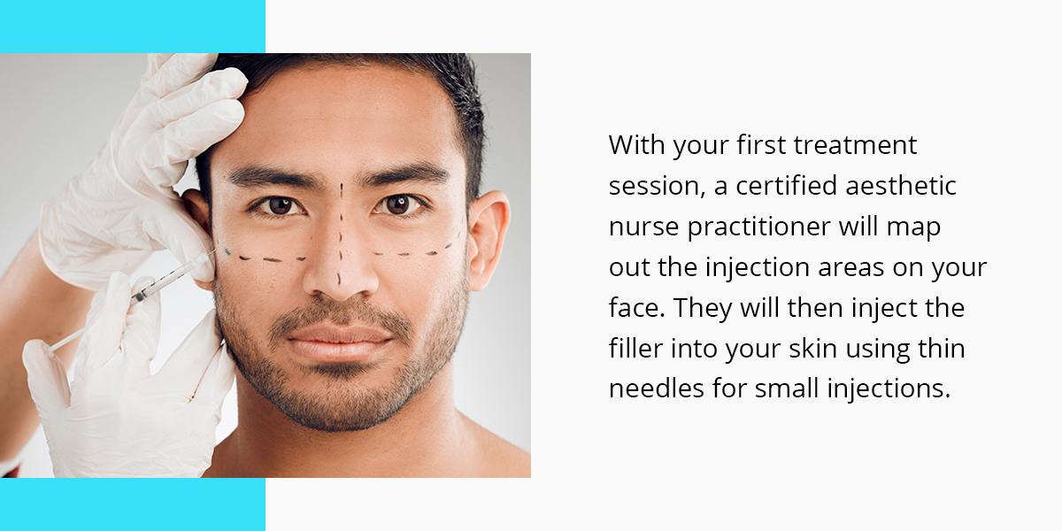 During your first treatment session, a certified aesthetic nurse practitioner will map out the injection areas on your face. They will then inject the filler into your skin using a thin needle for small injections. Patients can receive between one to three vials per treatment.