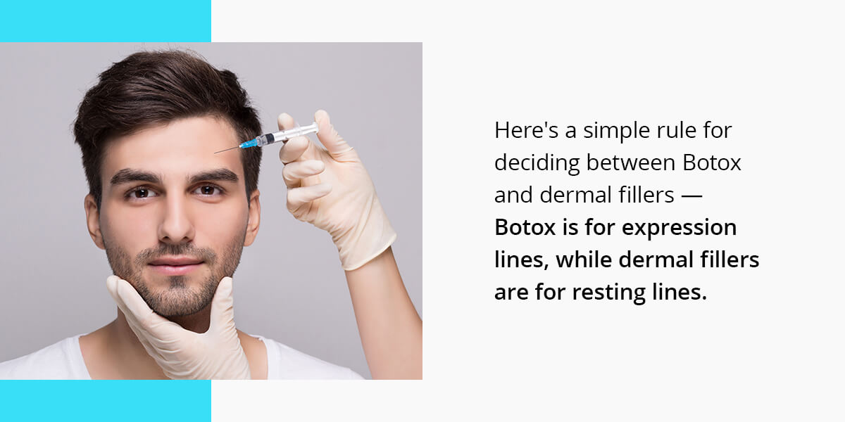 Here’s a simple rule for deciding between Botox and dermal fillers — Botox is for expression lines, while dermal fillers are for resting lines.