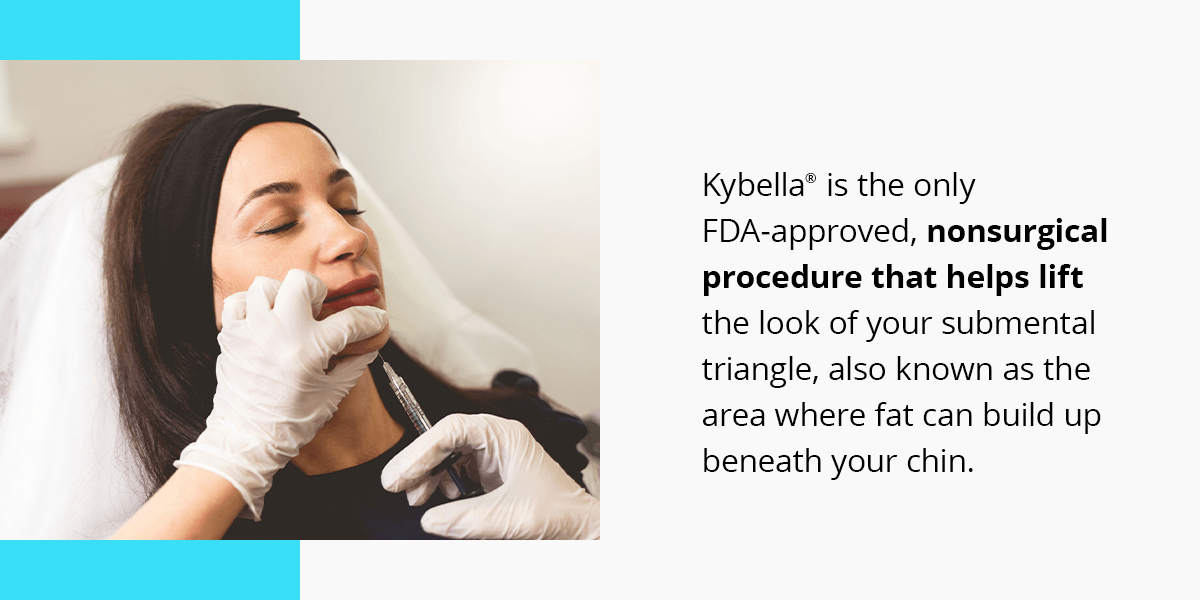 Kybella® is the only FDA-approved, nonsurgical procedure that helps lift the look of your submental triangle, also known as the area where fat can build up beneath your chin. The injection treatment uses a synthetic deoxycholic acid, which targets the fat in the area to give you a more defined, slim chin profile. If you are 21 years old or older, you can receive injections to help remove the moderate or severe fat beneath your chin.