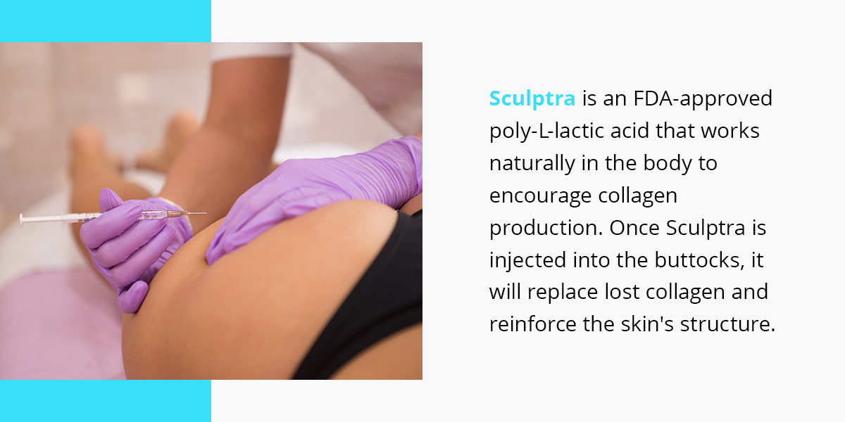 Specifically, Sculptra is an FDA-approved poly-L-lactic acid that works naturally in the body to encourage collagen production. As we age, collagen is lost, resulting in looser skin. Once Sculptra is injected into the buttocks, it will replace lost collagen and reinforce the skin’s structure.